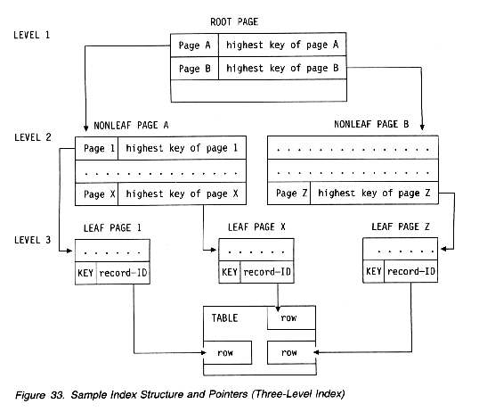 This RID ordering is maintained so that a binary search can locate the RID of interest efficiently. RID maps for type 2 indexes can contain as many RIDs as will physically fit on the page; they are not limited to 256 entries, as in type 1. Deleting a single duplicate no longer requires a slow sequential search of duplicates that can span multiple leaf pages. RID ordering improves performance in deleting or updating entries, when the number of duplicates is in the thousands.- Unless the table or table space is locked in mode X, a DELETE operation does not physically remove the entry. Instead, it pseudo-deletes the entry by leaving it in the page, but marks it for deletion. The space remains available in the index at least until the data is committed, so if a rollback takes place, there will always be enough room to insert the deleted entry and avoid the need to split the page. After the deleting operation commits, the committed pseudo-entry can be physically deleted when space is needed for an insert, or when the percentage of pseudo-deleted entries marked on a page reaches a certain threshold.